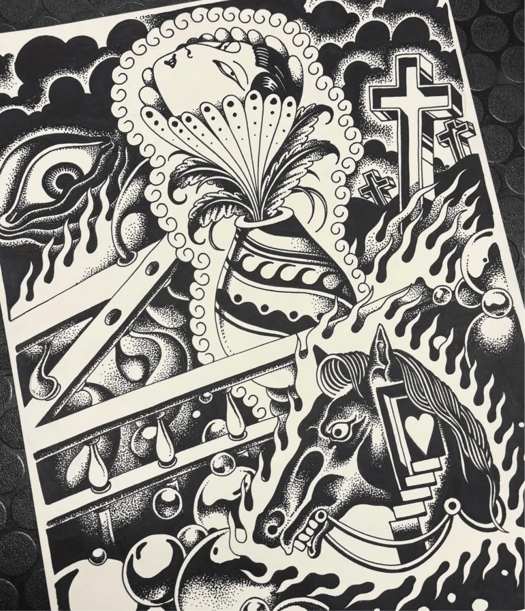 The man behind Mike Tazem’s image – Mike Tazem as in Vila Nova de Tazem and Mike Tyson put together, yes (they sound pretty similar in Portuguese… Should we reconsider some life decisions?). Voss is a tattoo artist, illustrator, living between Portugal and Germany. His creations always carry a caustic and nasty humour.